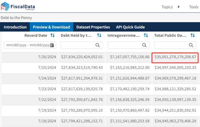据美国财政部网站公布的数据,截至7月26日,美国联邦政府的债务总额达到了惊人的35,001亿美元。这标志着美国政府的债务规模已经突破了35万亿美元的大关。 图片来自美国财政部官网。 2024年初,美国的国债总额首次达到了创纪录的3.4万亿美元。长期以来,不断增长的财政赤字让国债数量持续攀升,就像一个“定时炸弹”一样悬挂在上方,随时可能爆炸。